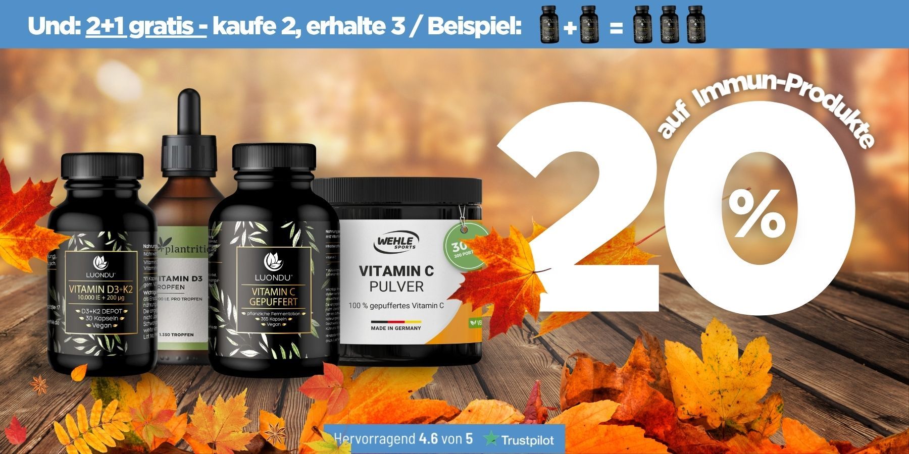 Stärken Sie Ihr Immunsystem in der Herbstzeit! Profitieren Sie von 20 % Rabatt auf alle Health- & Immunprodukte von Wehle Sports, Luondu und Plantrition.
